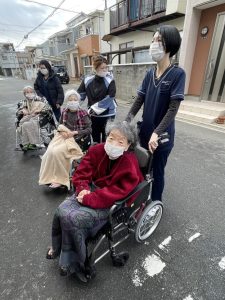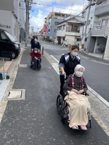 スタッフは一人ひとりのご利用者様と丁寧にコミュニケーションをとりながら、車椅子を押してゆっくりと公園内を散策。