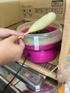 まずは小型の綿飴マシーンをセッティングし、スタッフが試作にチャレンジ!ところが、これがなかなか難しい…💦