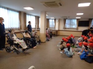 - 館内でのご挨拶と交流の時間 利用者様とお子様方がご対面!緊張しながらも、「こんにちは!」と元気な挨拶を交わし、楽しい交流の時間が始まりました。